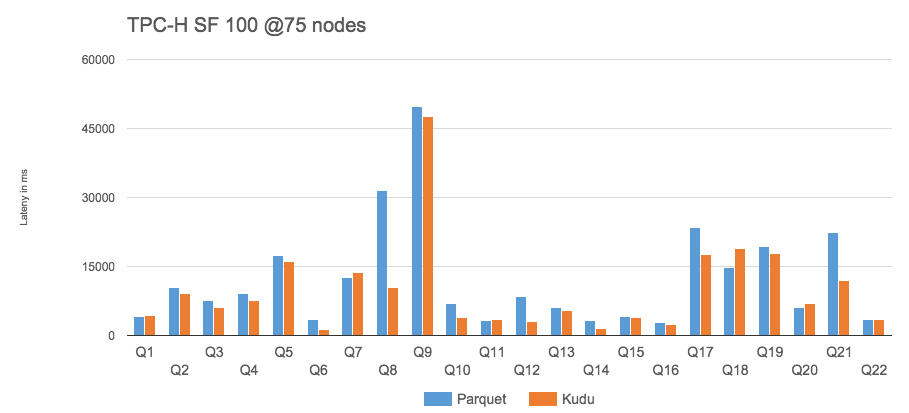 Kudu is implemented in C++, so it can scale easily to large amounts of memory per node. And because key storage data structures are designed to be highly concurrent, it can scale easily to tens of cores. With an in-memory columnar execution path, Kudu achieves good instruction-level parallelism using SIMD operations from the SSE4 and AVX instruction sets.