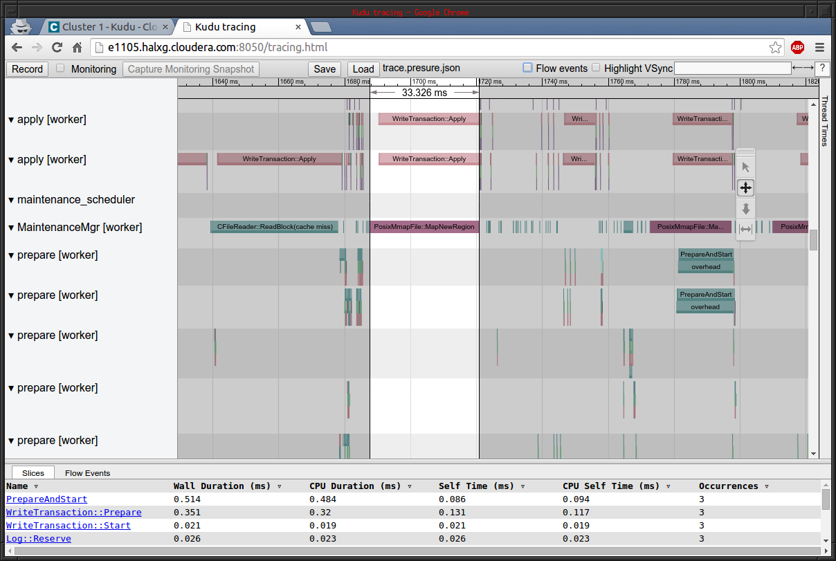 Ever since its first beta release, Kudu has included advanced in-process tracing capabilities, extensive metrics support, and even watchdog threads which check for latency outliers and dump "smoking gun" stack traces to get to the root of the problem quickly.
