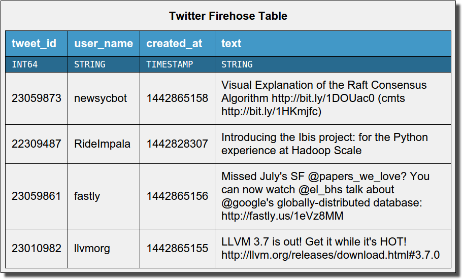 Kudu's simple data model makes it breeze to port legacy applications or build new ones: no need to worry about how to encode your data into binary blobs or make sense of a huge database full of hard-to-interpret JSON. Tables are self-describing, so you can use standard tools like SQL engines or Spark to analyze your data.